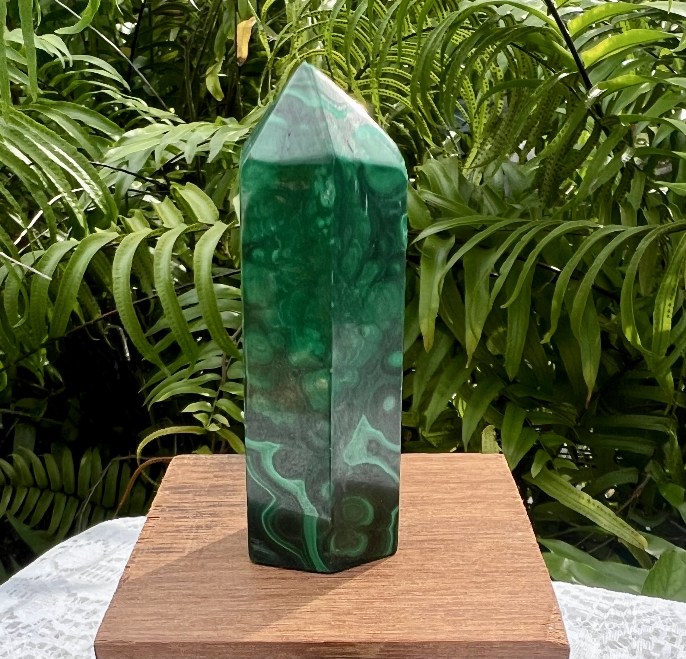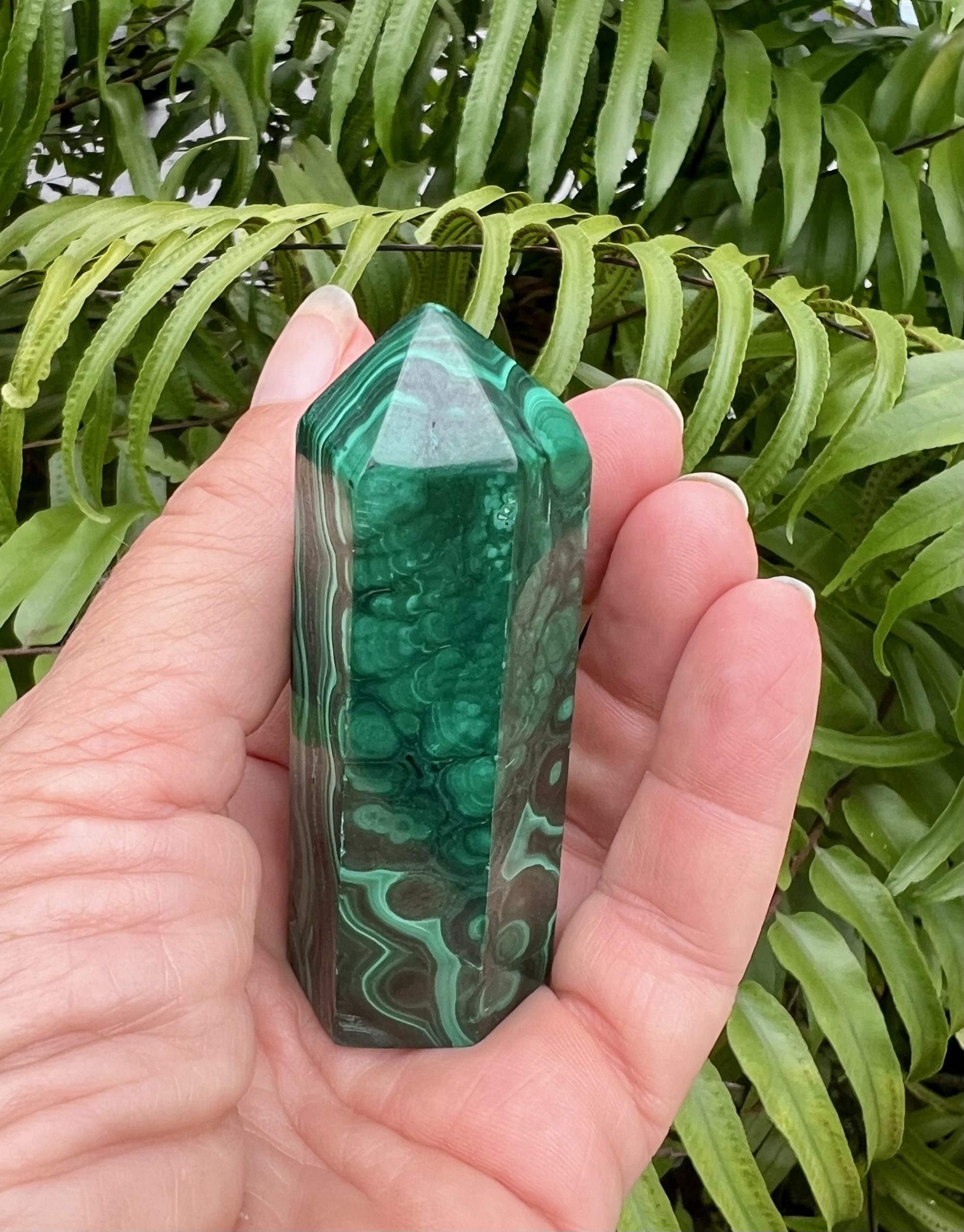Here’s a striking 3 inch Malachite tower, showcasing a beautiful deep green hue with mesmerizing natural patterns.
