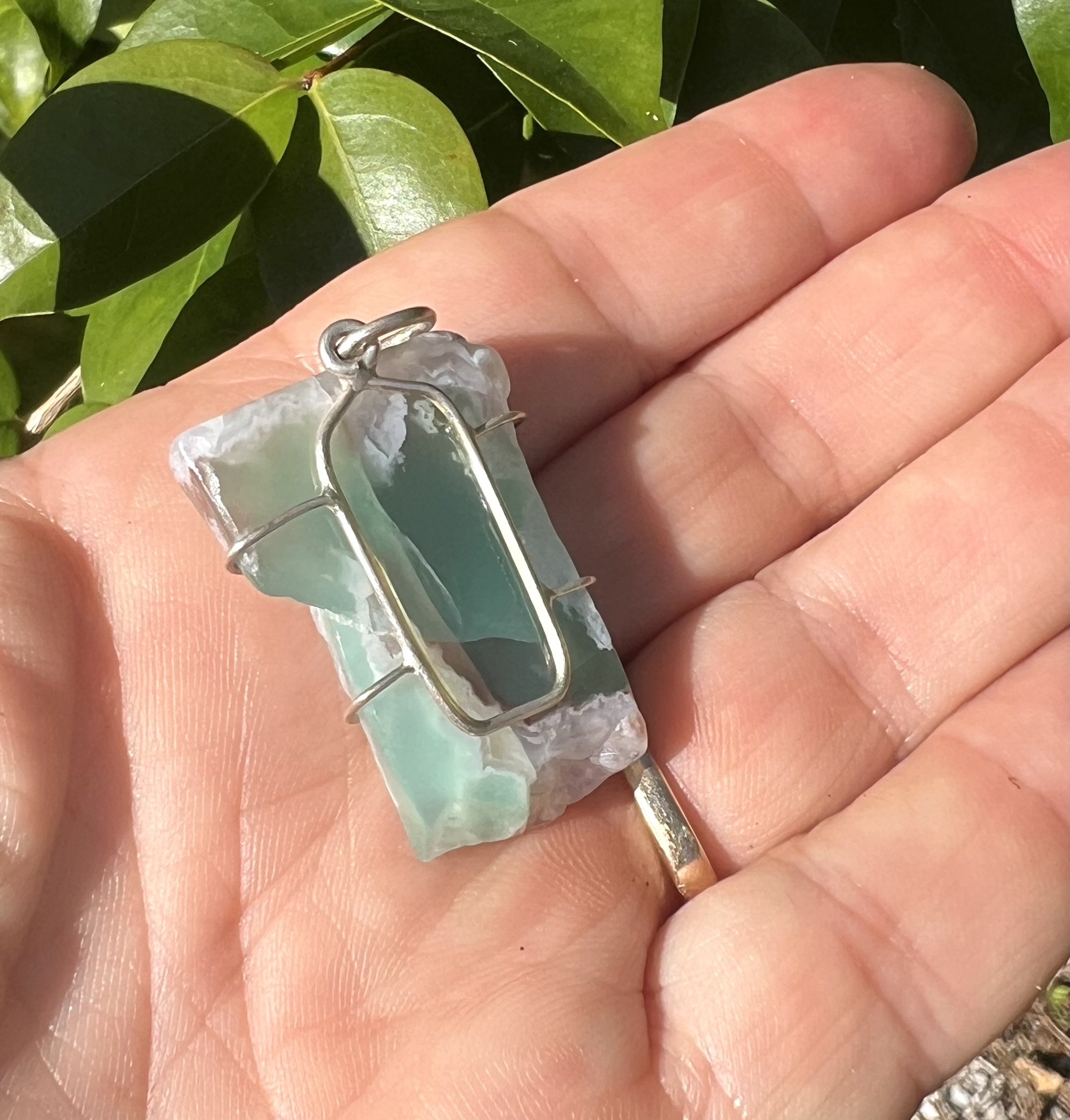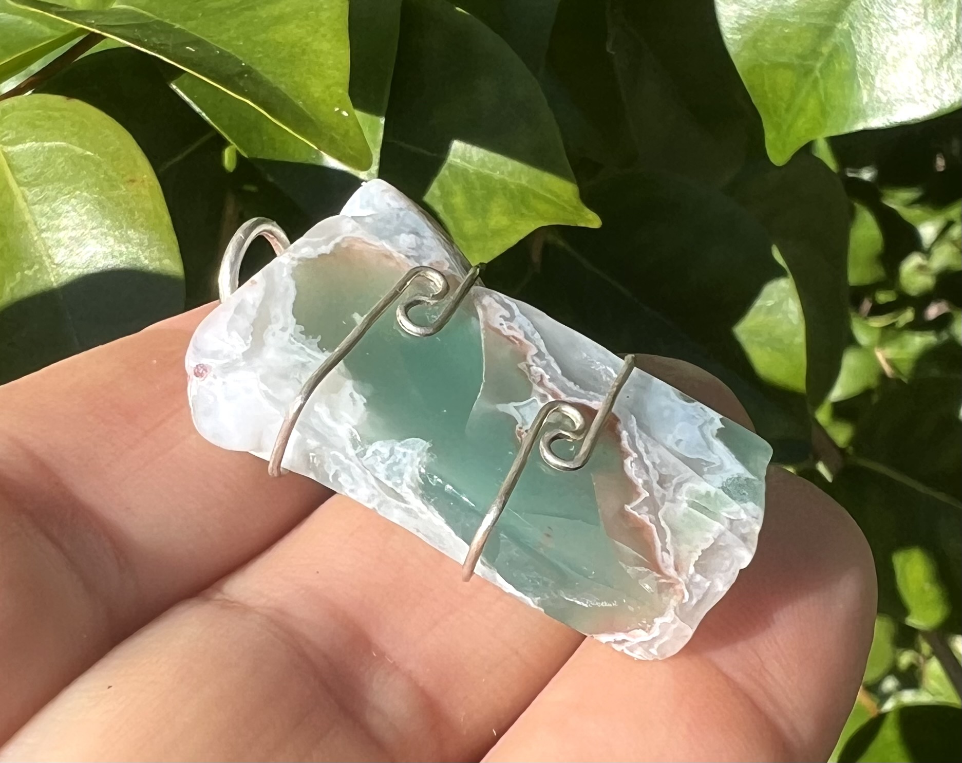 Set in a minimalist silver wrap, the natural rectangular stone reveals a mesmerizing dance of translucent blue-green hues.