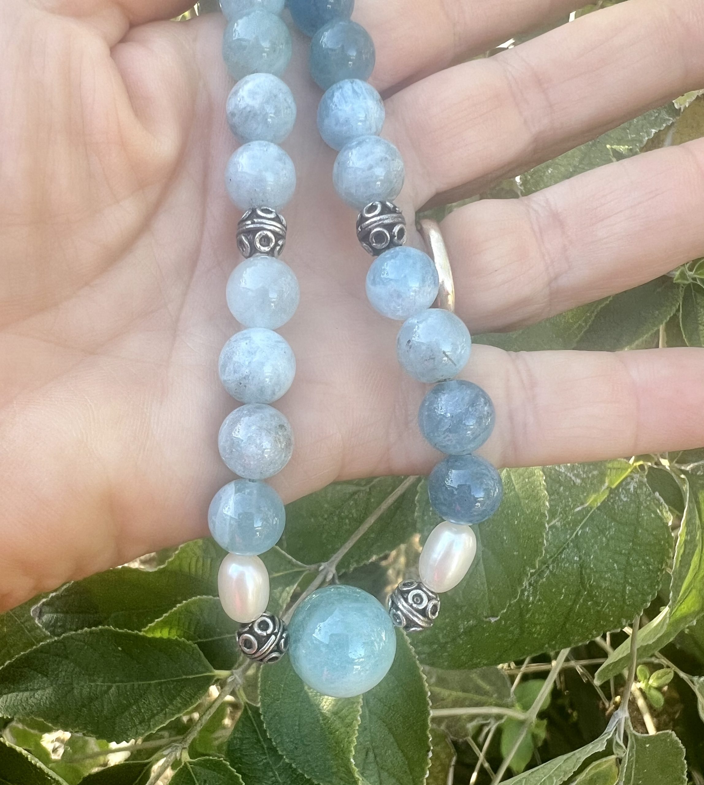 8mm Aquamarine beads white fresh water pearls and 2 more silver beads finish off this gemstone necklace.