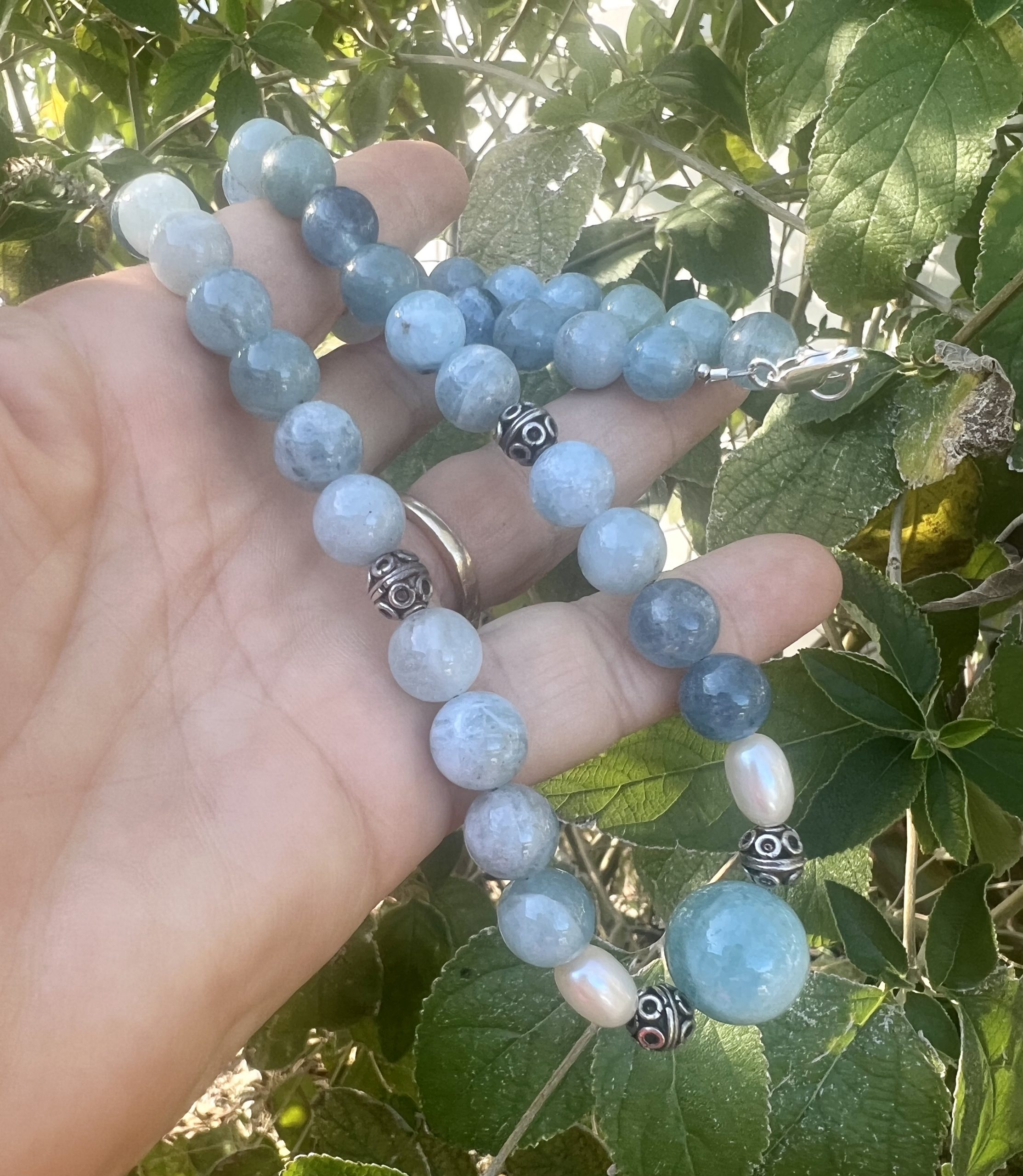 Aquamarine Necklace with White Pearl and Silver