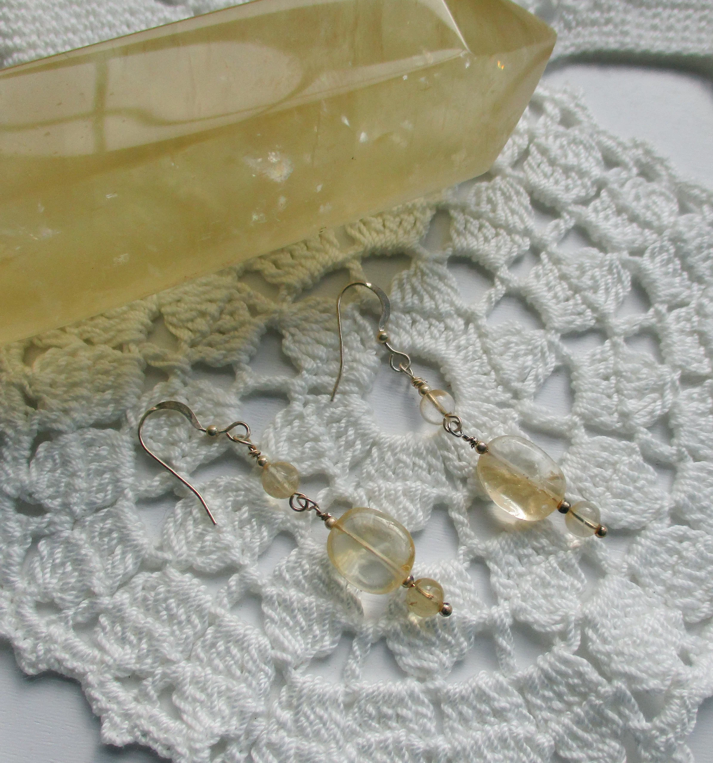 I combined sterling silver with oval and round Citrine beads to create these long dangle earrings.