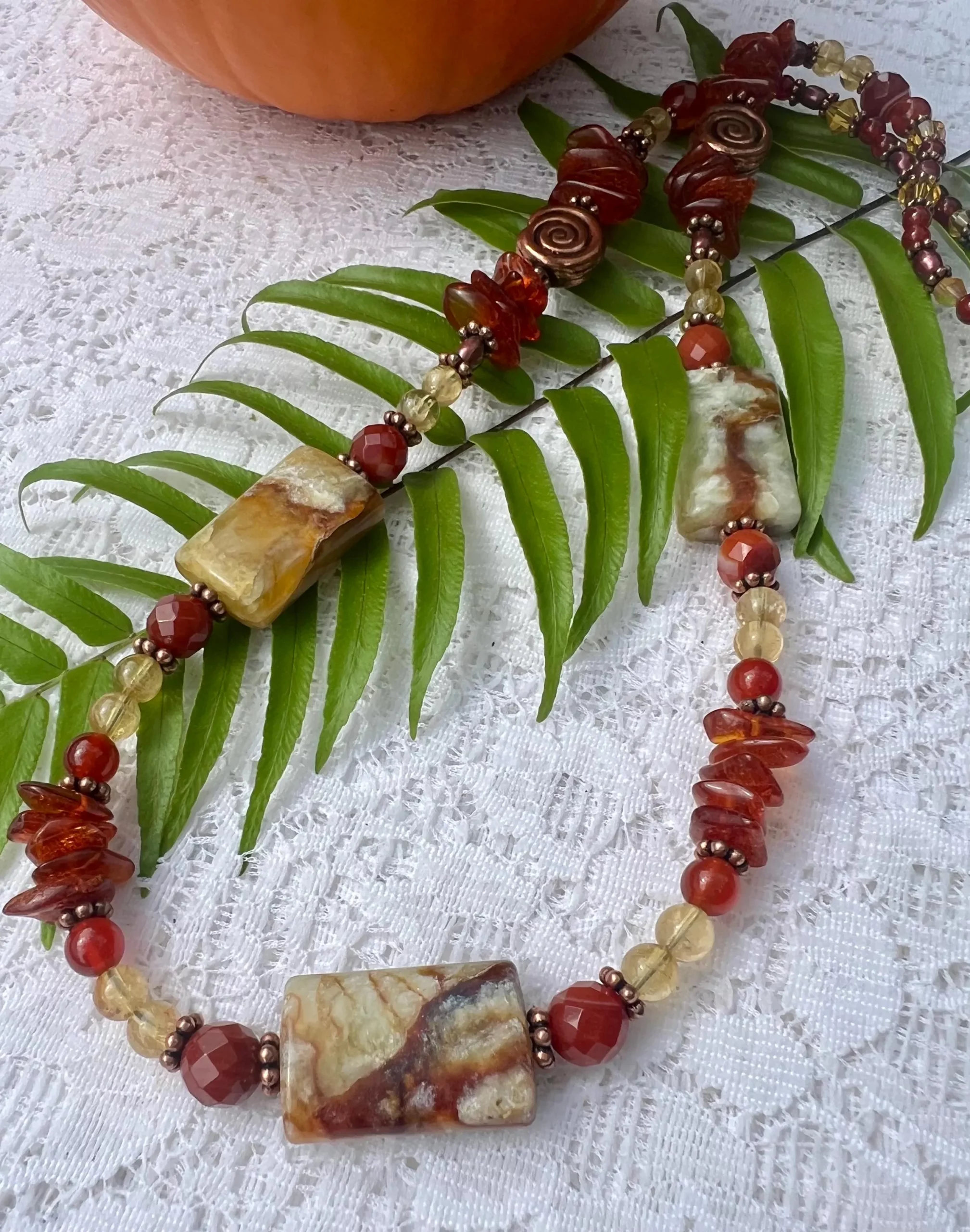 This handcrafted necklace showcases a rich, earthy palette inspired by the colors of fall.