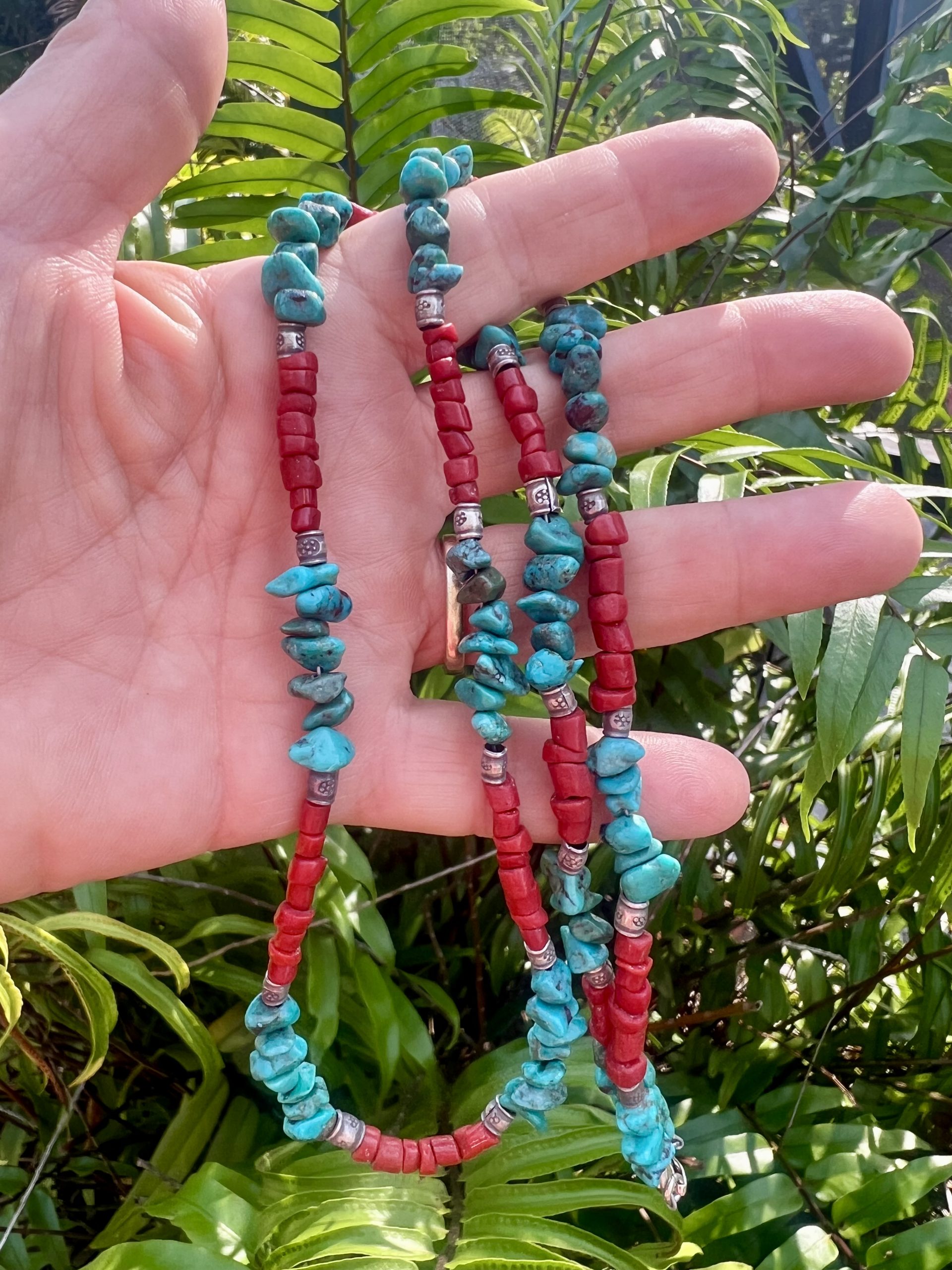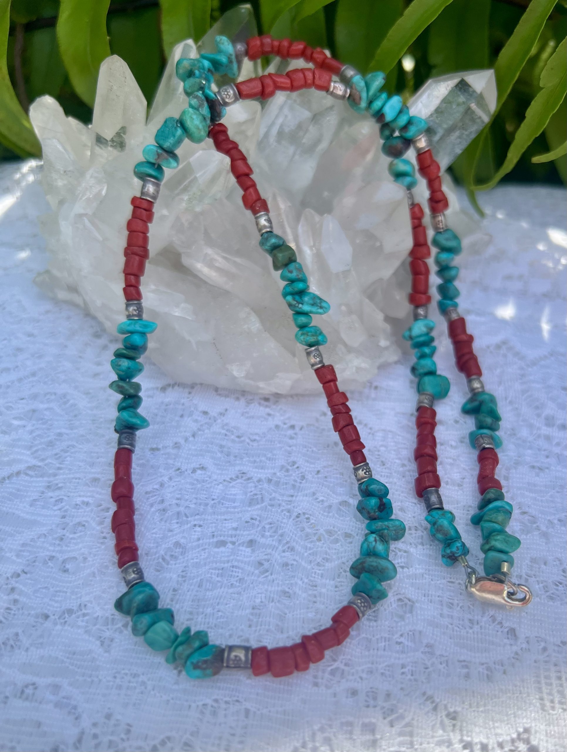 26 inches of natural beauty, handcrafted with genuine Turquoise nuggets and deep red Coral disc beads, accented by shining sterling silver beads and clasp.