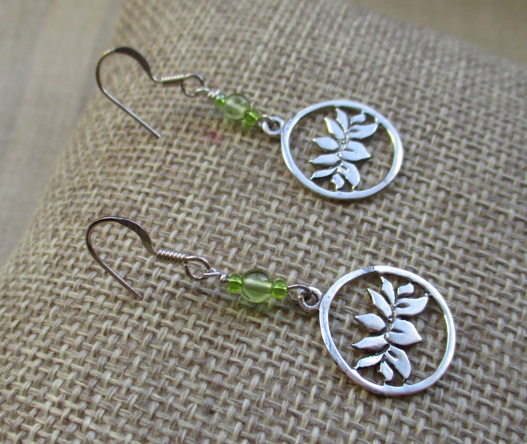 Sterling Silver lotus charm earrings are accented with Peridot to create these yoga inspired earrings.