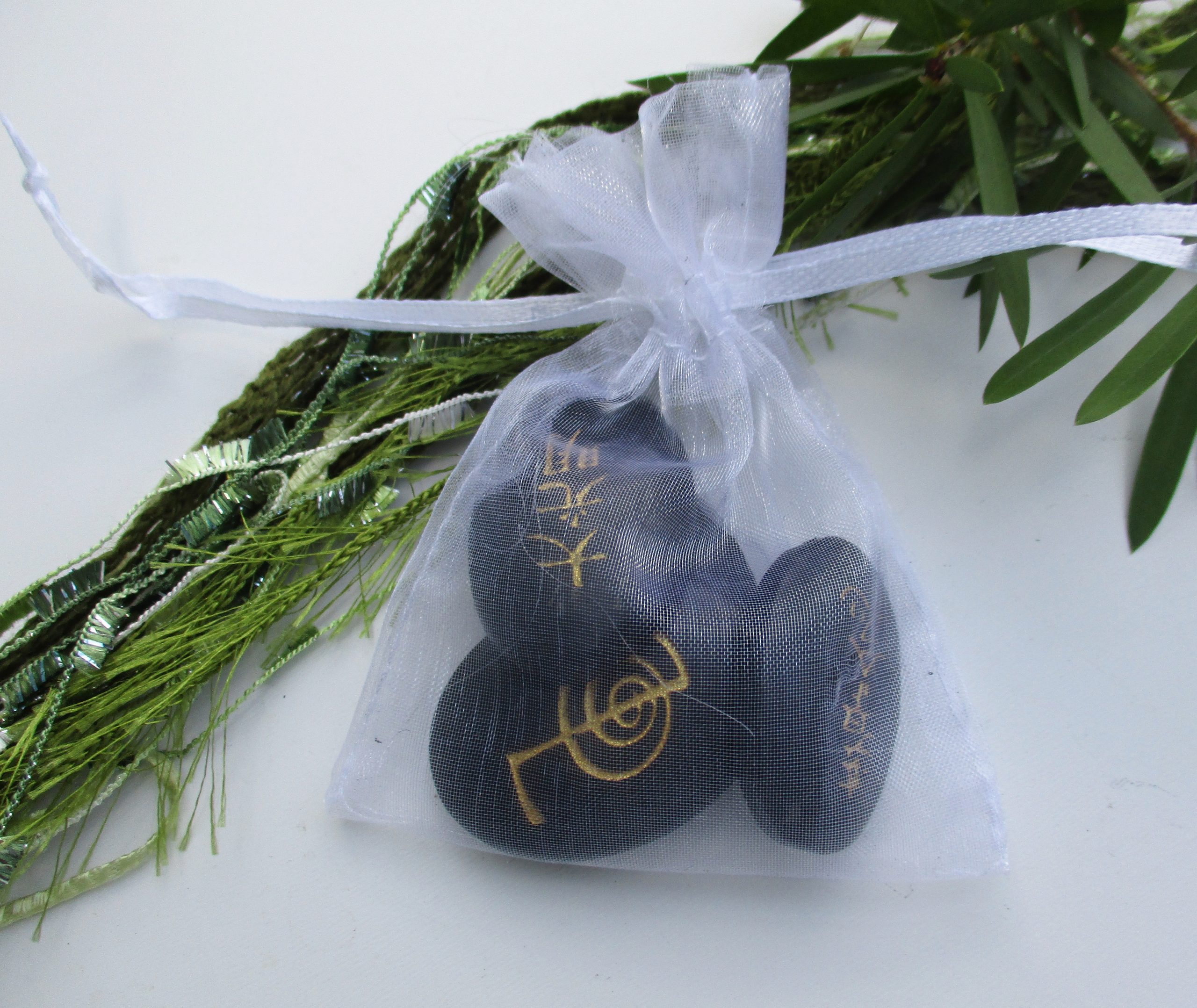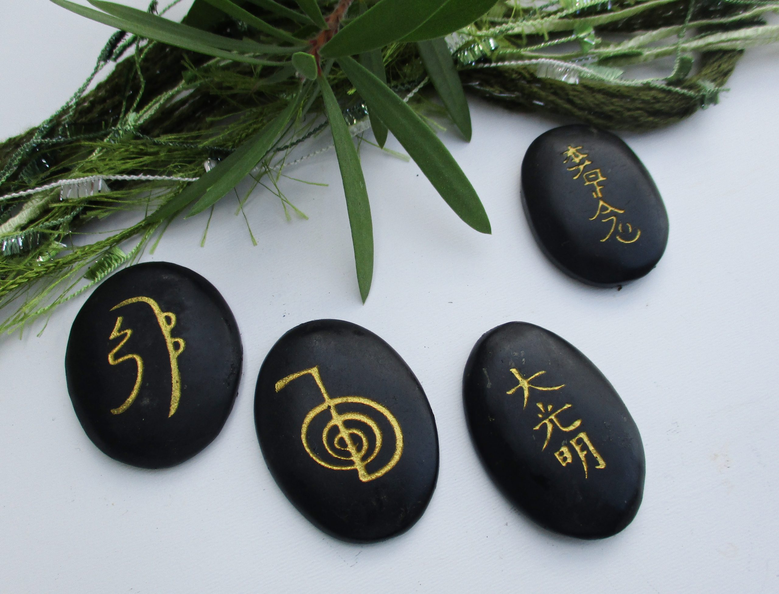 Set of 4 Usui Reiki Symbols engraved in gold on black Shungite