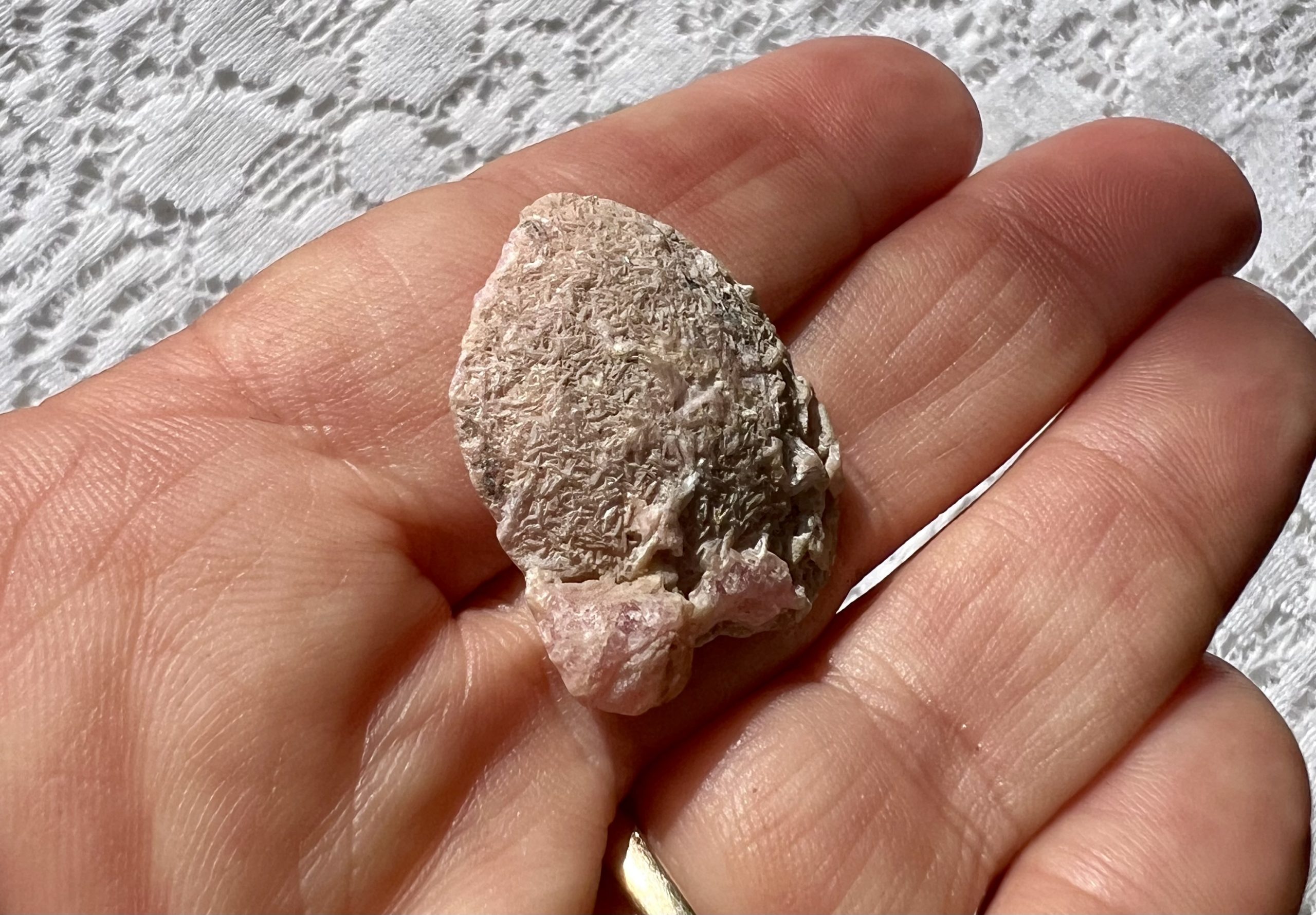 This one-of-a-kind Rhodochrosite cabochon is front polished to a luminous sheen, revealing a mesmerizing bull’s-eye pattern in vivid shades of pink, while the back remains raw and untouched, honoring the stone’s natural origin.