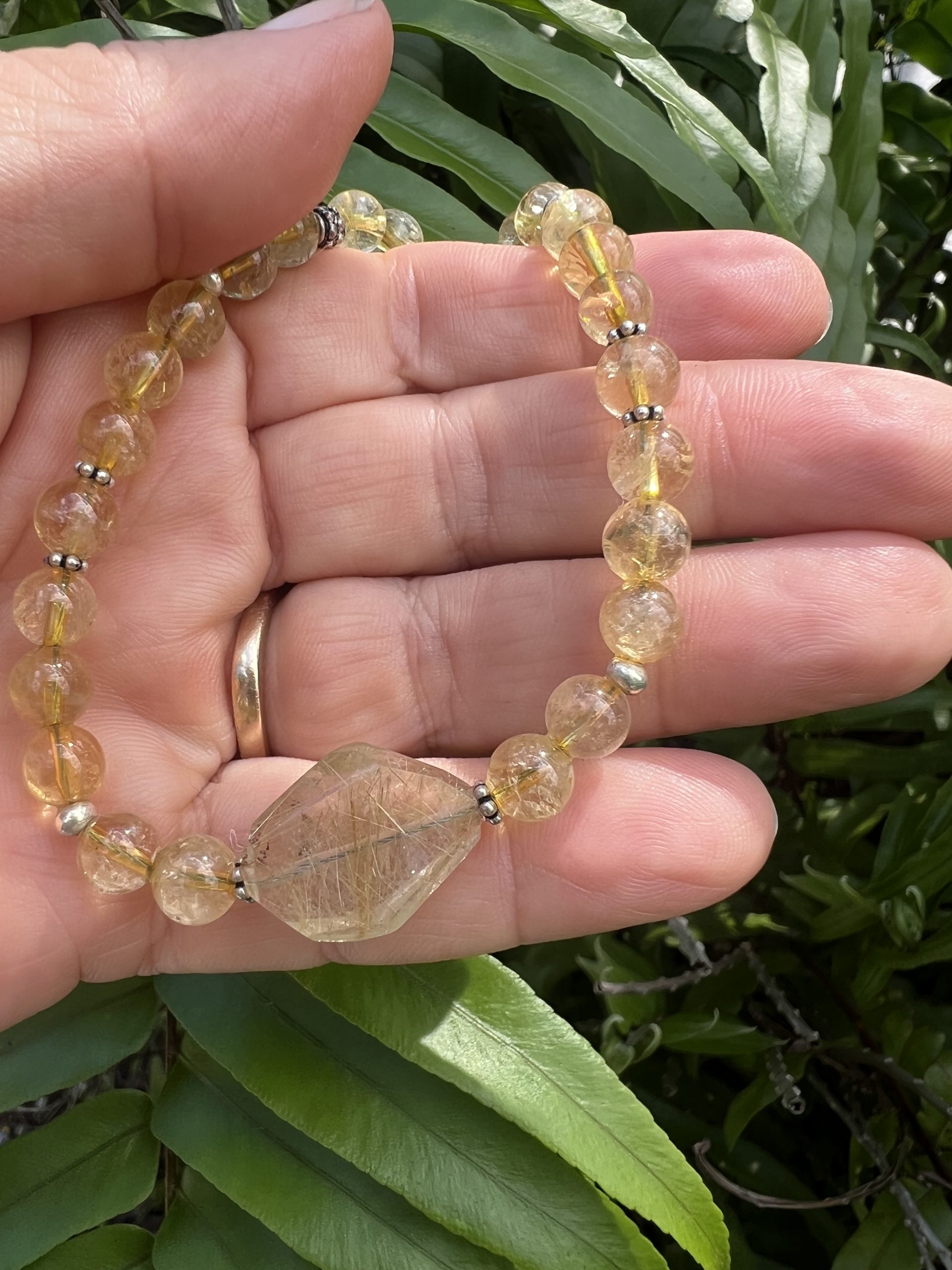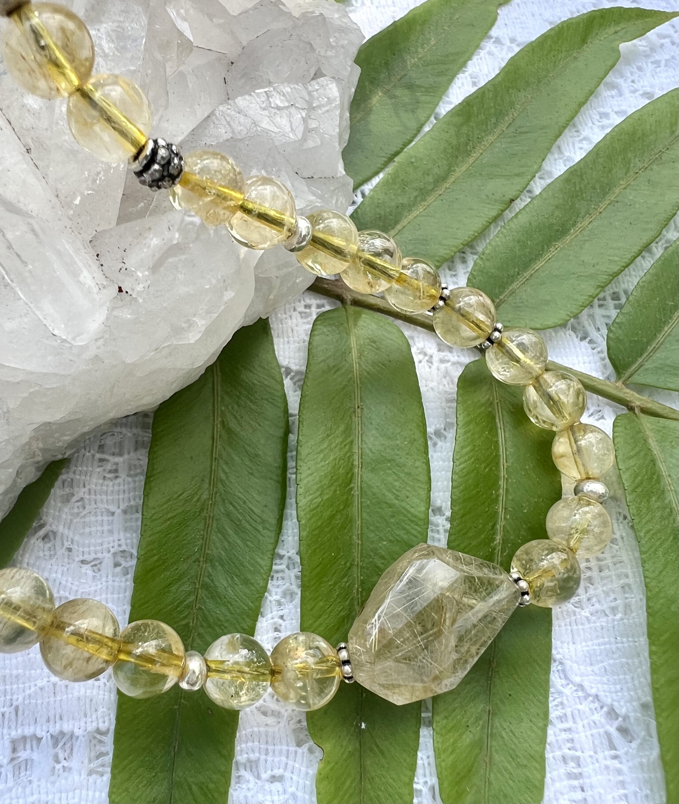The center attraction is a faceted 20 mm Rutilated Quartz bead that is just filled with golden Rutile needles.