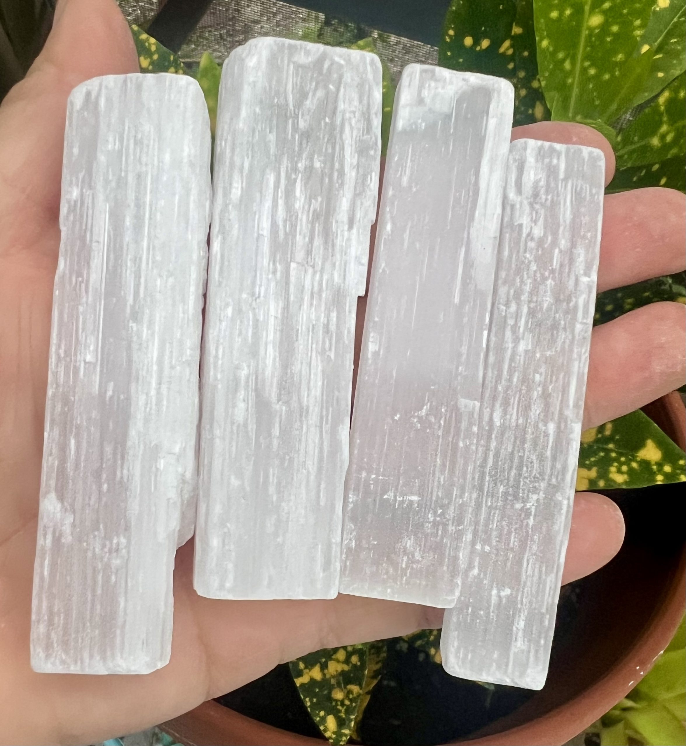 This set includes four raw Selenite sticks, each measuring approximately 3 inches—perfect for use as crystal wands, meditation tools, or energy-clearing companions.